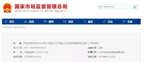 市場監(jiān)管總局辦公廳關(guān)于開展2021年度認(rèn)可與檢驗檢測服務(wù)業(yè)統(tǒng)計工作的通知